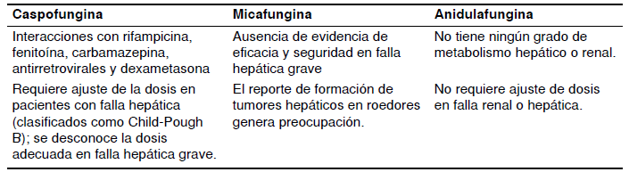 Dicho esto, es importante recordar las situaciones en las que los azoles son mejores que las equinocandinas, incluidos los casos con compromiso ocular o del sistema nervioso central (cuadro 4). Hay controversia sobre el tratamiento de las infecciones por C. parapsilopsis con las equinocandinas, debido a que su concentración inhibitoria mínima es más elevada en comparación con la encontrada con otras especies de Candida. Sin embargo, en los estudios clínicos no se ha determinado una diferencia estadísticamente significativa a favor de ninguno de los productos 51. Tampoco es claro si hay diferencias en la eficacia de las diversas equinocandinas debidas a su farmacocinética 40; el beneficio potencial podría darse en la selección de cepas resistentes y las interacciones medicamentosas. La frecuencia de descontinuación fue más elevada con la caspofungina, aunque mucho menor comparada con la anfotericina B (3,8 % Vs. más de 10 %) 52.
