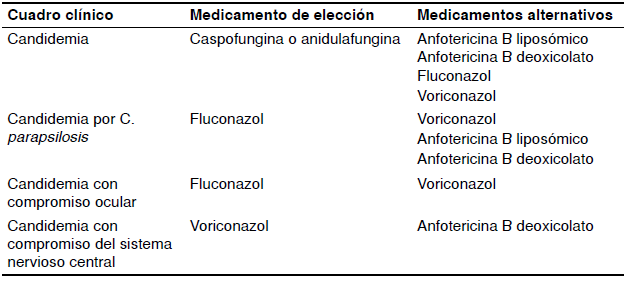 En el cuadro 4 se presentan esquemas terapéuticos recomendados para el manejo de la candidiasis invasiva o candidemia en cuatro situaciones, todos ellos formulados en los últimos seis años, siendo la más reciente actualización la de la guía de la Infectious Diseases Society of America (IDSA).