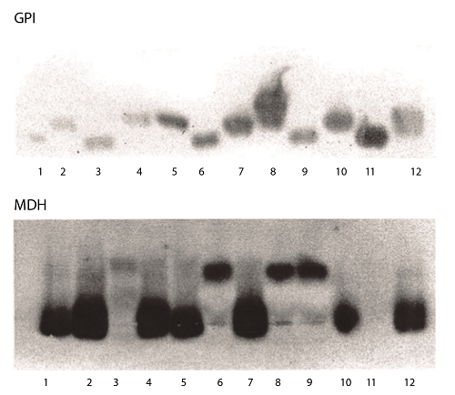 La caracterización con ocho sistemas enzimáticos y seis cepas de referencia, permitió observar que, con los sistemas GPI y MDH, la cepa de perro (carriles 2; 6; 9; 12) tenía una migración similar a la cepa de referencia M-2903 (complejo L. braziliensis) (carril 5) (figuras 2 y 3).