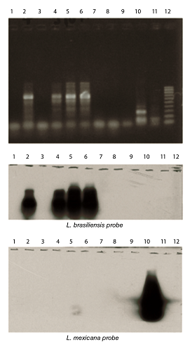 Etiquetado e hibridación. Se utilizaron tres sondas sondas ADNk (ADN del cinetoplasto) específicas para Leishmania: L. (L.) mexicana (MNYC/BZ/ M379), L. (L) chagasi (MHOM/BR/74/PP75) y L. (V) braziliensis (MHOM/ BO/90/CG), producidas mediante amplificación por PCR 21 utilizando los cebadores L1 y L2 adquiridos en el Laboratorio Eurogentec (Seraing- Bélgica). Los productos de la PCR se transfirieron a una membrana de nailon; la marcación de las sondas y la hibridación se hicieron con el sistema de detección del gen de quimioluminiscencia mejorado (ECL Amersham, Buckinghamshire, Reino Unido) según las instrucciones del fabricante.
