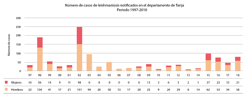 Aspectos epidemiológicos. En 22 años de estudio (1997 a 2018), se registraron 1.250 casos; fueron 1.104 (88,3 %) de leishmaniasis cutánea y 146 (11,7 %) de mucocutánea, con un promedio anual interepidémico de 37 casos por año, aproximadamente el 1,6 % del total nacional. El número total de hombres alcanzó los 922 (73,7 %) y se registraron 328 (26,3 %) en mujeres (figura 4) (el valor total de los años 2003 al 2007 no se discriminó por sexo). El porcentaje de casos importados del interior (La Paz, Santa Cruz, Cochabamba y Pando), o del exterior (Argentina), varió mucho según el año (3 a 47 %) y correspondió, en promedio, a 18 % de los casos registrados.