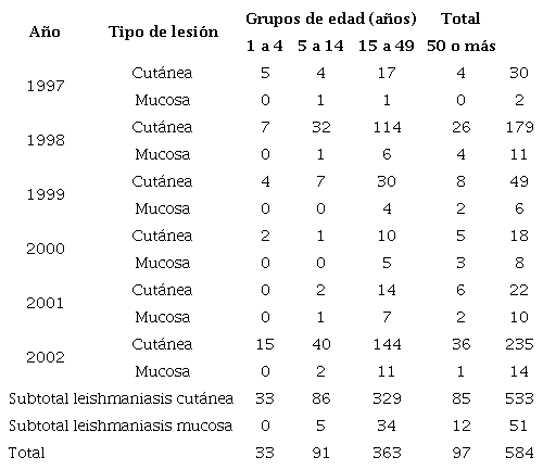 Por otra parte, los antecedentes de la fecha probable de infección, evolución de las lesiones y signos clínicos de los 51 pacientes con lesiones mucosas reportados en el estudio de brote, revelaron que las lesiones cutáneas no diagnosticadas ni tratadas por el sistema de salud habían evolucionado durante años, lo que sugiere la existencia de casos de leishmaniasis tegumentaria años antes de la primera notificación. El porcentaje total de casos de leishmaniasis mucosa fue de 11 %.