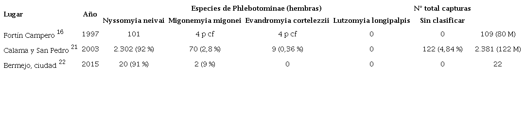 Al muestreo inicial de 1997 se añadieron otras dos capturas: la segunda captura (INLASA/IRD; 2003) 22, de 2.503 flebotomíneos (2.392 hembras y 111 machos), con predominio de Ny. neivai, en Naranjitos, Alto Calama y San Telmo, y la tercera, realizada por el técnico Julio Vidaurre (2015) 25 en el barrio San José (periferia de la ciudad de Bermejo) y en la cual se capturaron 22 especímenes: 12 en el domicilio y 10 en el peridomicilio; 20 de ellos eran Ny. neivai (13 hembras) y dos eran Mg. migonei (1 hembra). En ninguno de los tres estudios realizados se aislaron parásitos de Leishmania spp. (cuadro 2).