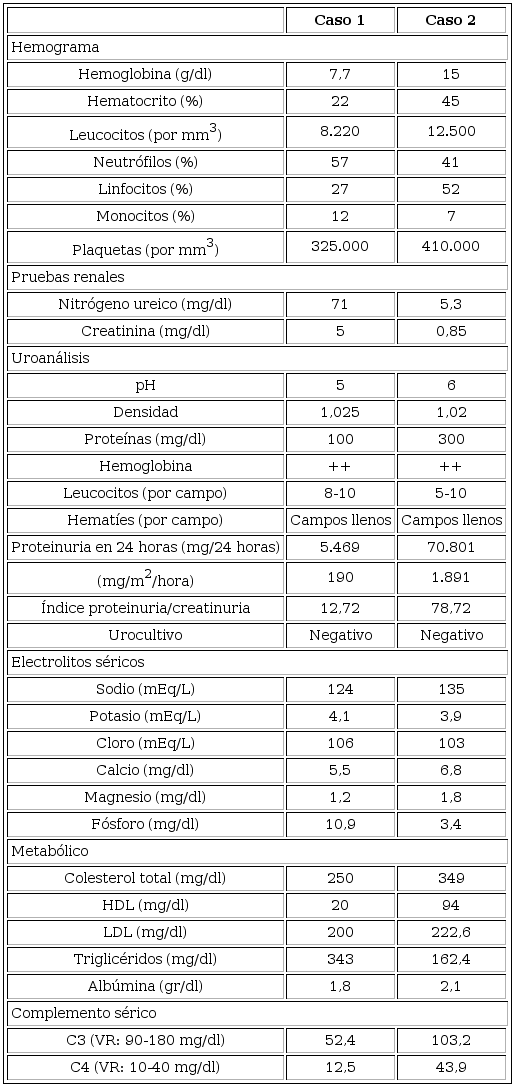 Los resultados de los exámenes paraclínicos de ingreso se presentan en el cuadro 1. Se encontró proteinuria en rango nefrótico, además de dislipidemia e hipoalbuminemia, pero no había afectación ganglionar ni articular, como tampoco dolor.