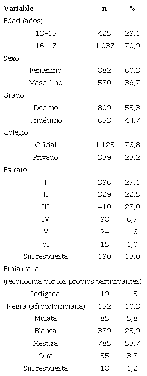 Un total de 1.547 estudiantes diligenciaron los cuadernillos, pero en 85 (5,5 %) de ellos se omitieron respuestas, por lo que se excluyeron del análisis y, en consecuencia, la muestra final fue de 1.462 estudiantes. La media de la edad fue de 14,4 años (desviación estándar, DE=0,8). La caracterización sociodemográfica de los estudiantes se presenta en el cuadro 1. Los instrumentos de medición mostraron una aceptable coherencia interna (cuadro 2).