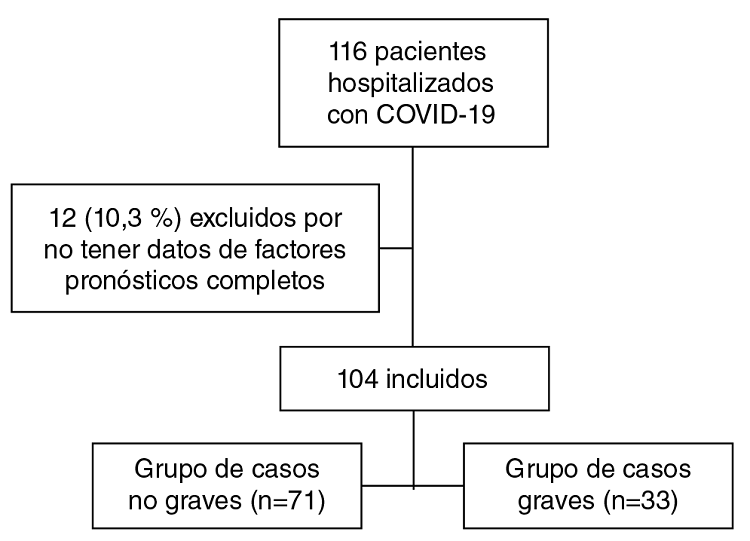 Se incluyeron 104 pacientes que cumplían con los criterios de selección. En el 68,2 % (n=71), de ellos la infección no fue grave y en el 31,7 % (n=33), lo fue (figura 1). El 9,6 % (n=10) murió y de dicho porcentaje el 90 % (9 casos) tenía la infección grave.