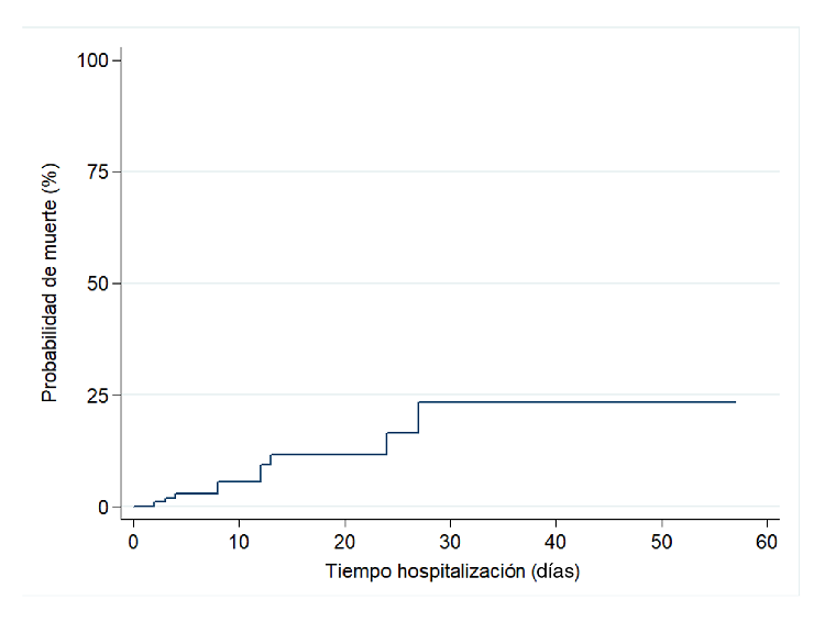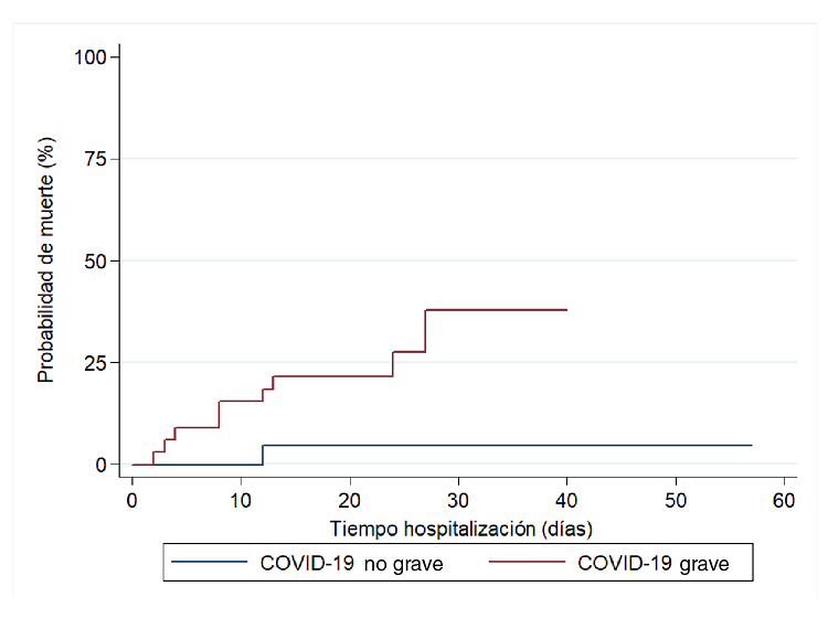 La supervivencia global se analizó con el estimador de Kaplan-Meier estableciendo como evento de interés la mortalidad y como resultado secundario, la gravedad. Todos los pacientes tuvieron seguimiento complete y no hubo censuras. El tiempo hasta el evento correspondió a los dias transcurridos desde el inicio de la hospitalización hasta la muerte o el egreso. Las variables con valores de p<0,20 en el análisis bivariado se consideraron para el análisis multivariado.