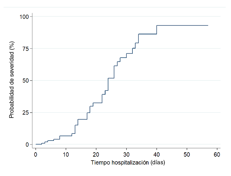 Se encontraron 33 casos graves y la incidencia acumulada de gravedad fue de 31,7 %. Teniendo en cuenta que el tiempo en riesgo de los 104 pacientes fue de 1.403 días, se estimó una tasa de gravedad en la cohorte de 2,3 por 100 pacientes-día (figura 4).