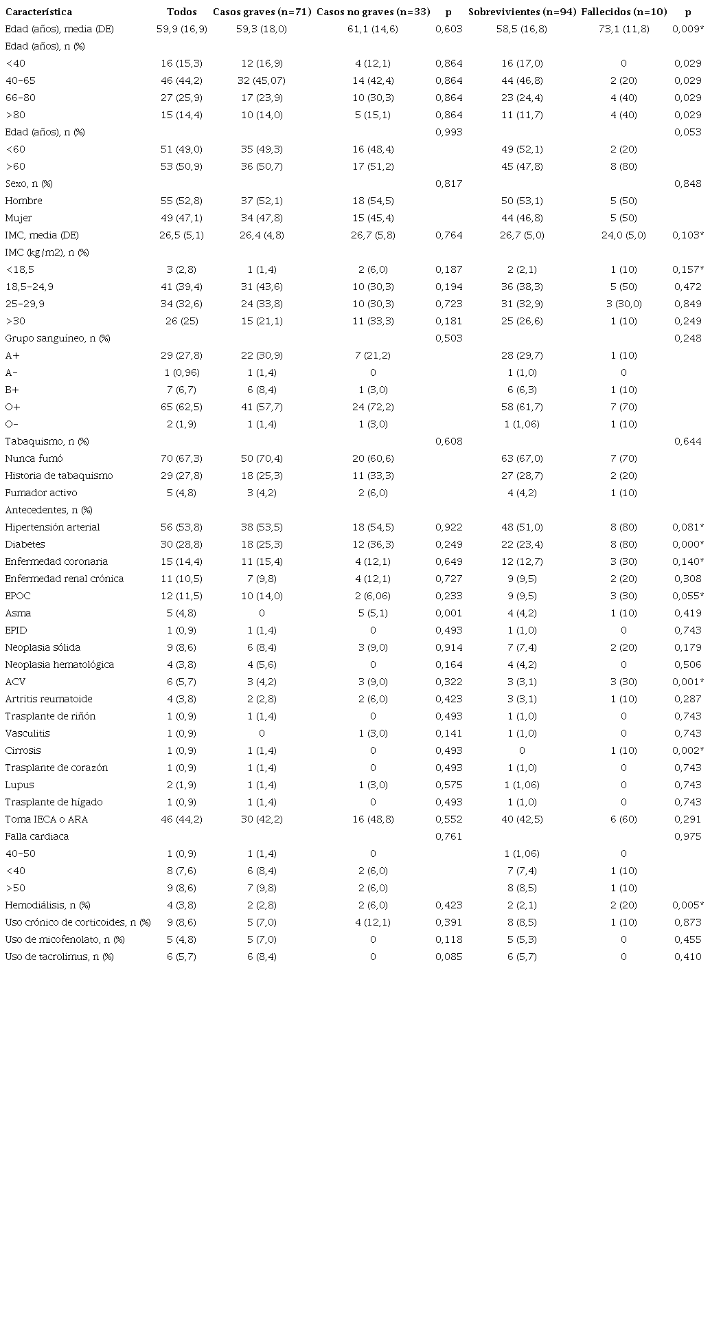 En cuanto a la edad, la media fue de 59 años (desviación estándar, DE de 16,9) y se encontró una diferencia significativa entre los pacientes que murieron y los que sobrevivieron, con medias de 58,5 (DE de 16,8 y 73,1, respectivamente) (p=0,009). En cuanto al sexo, el 52,8 % correspondió a hombres (n=55) y no se encontraron diferencias significativas entre hombres y mujeres en la gravedad o la mortalidad. La media del índice de masa corporal (IMC) fue de 26,5 (DE=5,1) y no se observaron diferencias significativas para esta variable entre los grupos. En cuanto al grupo sanguíneo, la mayoría de los pacientes eran 0+ (62,5 %, n=65), y no se encontraron diferencias para la gravedad o la mortalidad. El 29,5 % de los pacientes tenía historia de tabaquismo o eran fumadores activos, aunque no hubo diferencias entre los grupos. La prevalência de hipertensión arterial fue de 53,8 % (n=56) y 8 de los 10 pacientes que murieron tenían antecedente de esta condición. El 28,8 % de los pacientes era diabético y 8 de los 10 que murieron tenían la enfermedad (p=0,000). La descripción detallada de las características sociodemográficas y clínicas de los individuos incluidos en el estudio se presenta en el cuadro 1.