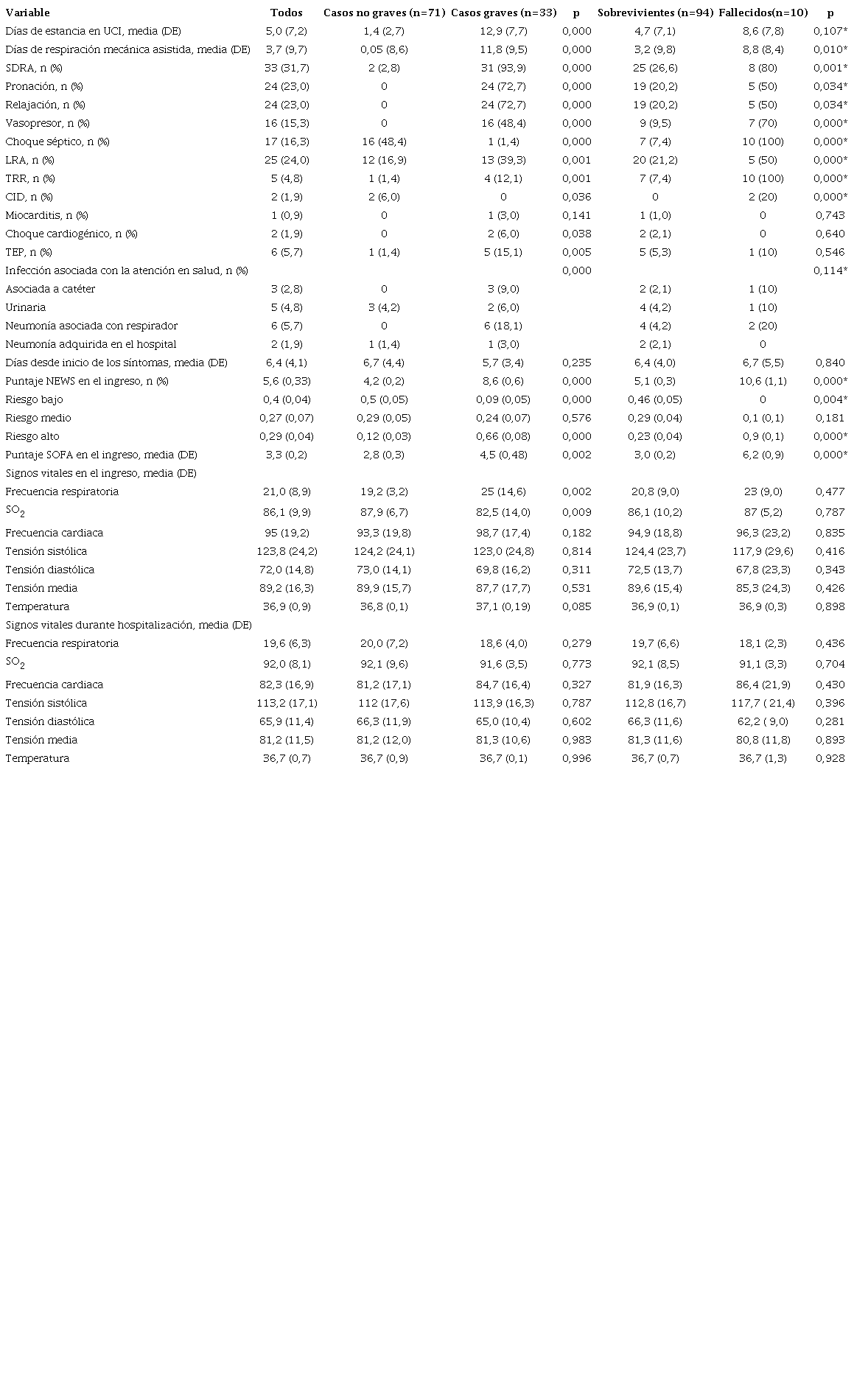 La hospitalización en la unidad de cuidados intensivos fue necesaria en 56 pacientes (53,8 %), con una media de estancia de cinco días (DE=7,2). Se encontró una diferencia significativa en el tiempo de estancia entre los pacientes con enfermedad grave y aquellos que no la presentaron, con medias de 12,9 (DE=7,7) y 1,4 días (DE=2,7), respectivamente (p=0,000). La media de tiempo con necesidad de respiración mecánica asistida fue de 3,7 días (DE=9,7) y fue más alta entre los fallecidos (8,8 días, DE=8,4; p=0,010). El 31,7 % de los pacientes presentó síndrome de dificultad respiratoria aguda, siendo esta variable un factor de riesgo significativo para la gravedad (p=0,000) y la mortalidad (p=0,001). Todos los pacientes que requirieron pronación y relajación (n=24; 23 %) pertenecían al grupo de casos graves (p=0,000) y, de ellos 5 murieron (p=0,034). Asimismo, todos los pacientes que requirieron uso de vasopresores (n=16, 15,3 %) pertenecían al grupo de los casos graves y, de estos, 7 fallecieron (p=0,000).