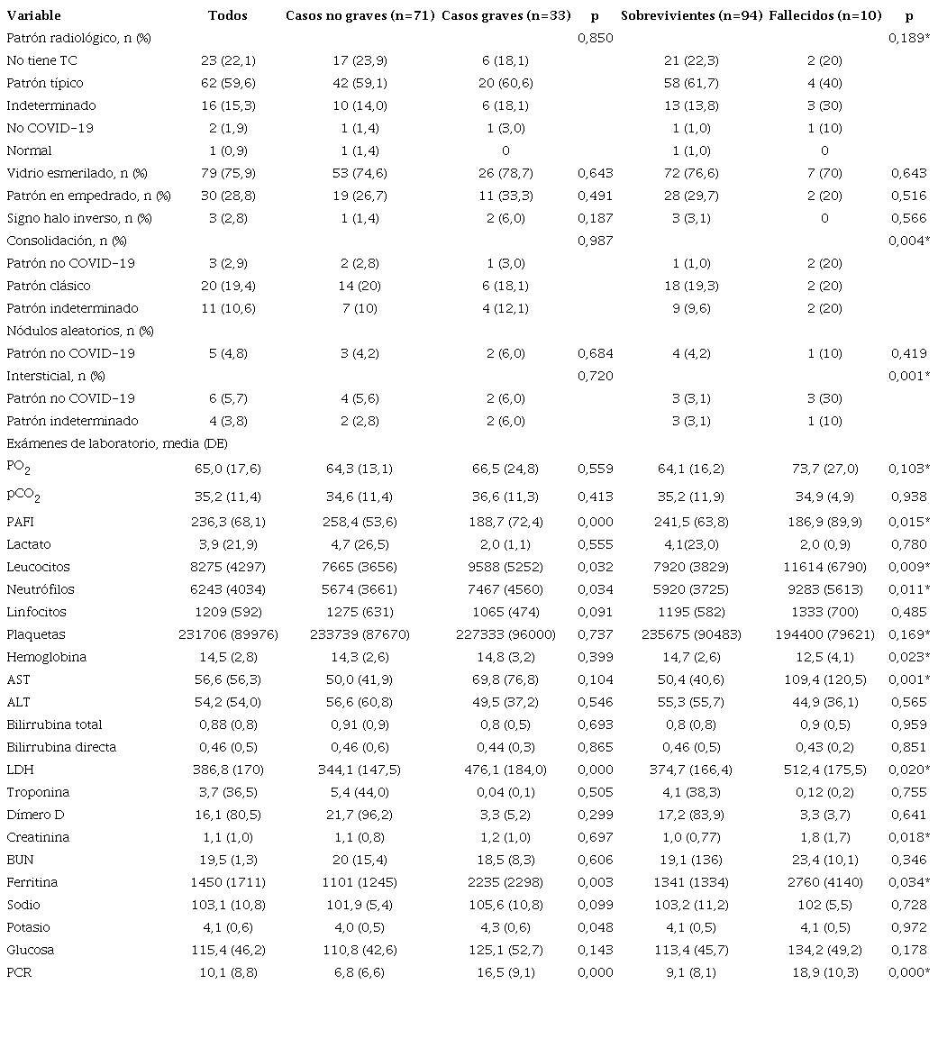 El patrón radiológico típico de la COVID-19 se evidenció en 62 pacientes (69,6 %): 79 con patrón radiológico en vidrio esmerilado (75,9 %); 30 con patrón en empedrado (28,8 %), y en 3 se observó el signo del halo invertido (2,8 %). No se encontró una relación entre estos hallazgos y la gravedad o la mortalidad. De los 34 (32,9 %) pacientes que tuvieron consolidación, 20 (19,4 %) presentaron el patrón clásico de la COVID-19; 3 (2,9 %), uno diferente, y 11 (10,6 %) se consideraron hallazgos indeterminados. Se encontró una asociación significativa entre la consolidación y la mortalidad (p=0,004). Se observaron nódulos aleatorios en 5 pacientes (4,8 %) y anormalidades intersticiales en 10 (9,5 %). Los resultados radiológicos y paraclínicos se presentan en el cuadro 3.
