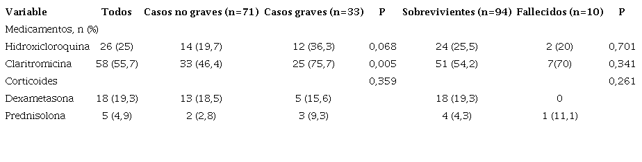 De los 26 pacientes que recibieron hidroxicloroquina, 12 eran casos graves y 14 no lo eran; 2 de los pacientes que recibieron este tratamiento fallecieron. De los 10 pacientes que fallecieron, 2 presentaron prolongación del intervalo QT; del grupo total, 8 (7,6%) presentaron esta alteración del ritmo cardiaco y 4 de ellos habían recibido tratamiento con hidroxicloroquina. El 55,7 % de los pacientes recibió tratamiento con claritromicina (n=58) y se encontró una relación significativa entre el uso de este medicamento y la gravedad de la enfermedad, ya que el 75,7 % de los pacientes con infección grave lo recibieron (p=0,005); 23 (24,2 %) pacientes recibieron tratamiento con corticoide y no se observó una relación entre su uso y la gravedad o la mortalidad. La información sobre el uso de medicamentos se presenta en el cuadro 4.