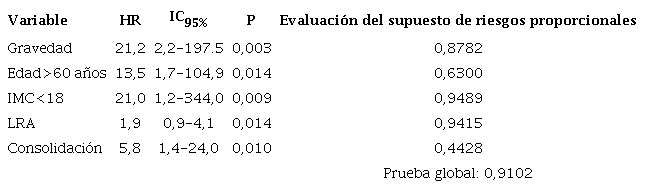 Para el análisis multivariado se tomaron las variables con p<0,2 en el análisis previo y se tuvo en cuenta la plausibilidad biológica para incluirlas en el modelo, de manera que en un primer modelo se incluyeron las siguientes variables: gravedad, edad, IMC, hipertensión arterial, diabetes, enfermedad coronaria, accidente cerebrovascular, lesión renal aguda, coagulación intravascular diseminada, infecciones asociadas con la atención en salud, consolidación y presión parcial de dióxido de carbono (pC02). A partir de este modelo, y con el fin de tener uno más parsimonioso, se sacaron las variables con los valores más altos de p una a una y se dejaron solo aquellas con significación estadística. Se encontró que la gravedad aumentó el riesgo de mortalidad 21,2 veces (p=0,003), la edad mayor de 60 años, 13,5 veces (p=0,014), el IMC menor de 18, 21 veces (p=0,009), tener lesión renal aguda, 1,9 veces (p=0,014) y tener consolidación, 5,8 veces (p=0,010). No se encontró violación del supuesto de riesgos proporcionales en la evaluación de los residuales de Schoenfeld (p=0,91) (cuadro 5).