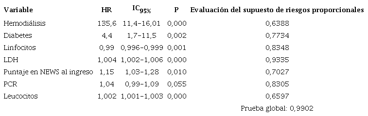 A partir de este modelo, y con el fin de tener uno más parsimonioso, se excluyeron las variables con los valores más altos de p una a una y se dejaron solo aquellas con significación estadística. Se encontró que las variables asociadas con el riesgo de gravedad fueron la hemodiálisis (HR=135,6; p=0,000), la diabetes (HR =4,4; p=0,002), la LDH (HR=1,004; p=0,000), el puntaje NEWS2 en el ingreso (HR=1,15; p=0,010) y los leucocitos (HR=1,002; p=0,000). Se determinó que los linfocitos eran un factor protector frente a la gravedad (HR=0,99; p=0,001). No se encontró violación del supuesto de riesgos proporcionales en la evaluación de los residuales de Schoenfeld (p=0,99) (cuadro 6).