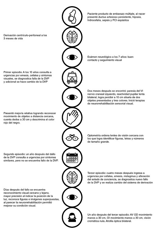 El diagnóstico final después del tercer episodio fue de atrofia óptica bilateral, parálisis cerebral mixta espástico-distónica de predominio izquierdo, hidrocefalia con derivación ventrículo-peritoneal, discapacidad intelectual y física (con deficiencia visual en seguimiento), leucomalacia periventricular y síndrome de ventrículos rígidos. En la figura 3 se presenta una síntesis gráfica de la evolución de la paciente, con los principales momentos clínicos y los resultados obtenidos.