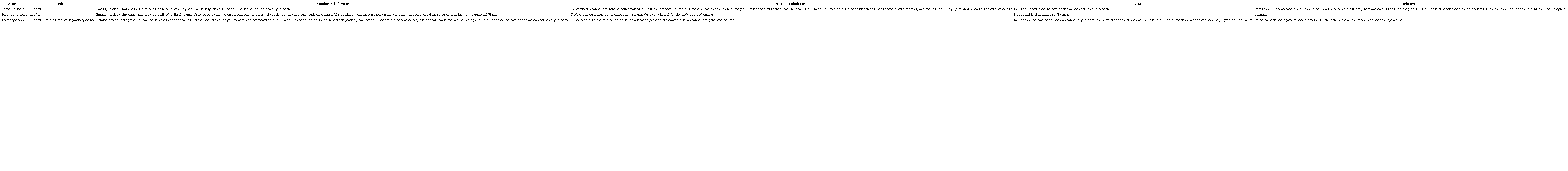 A partir de los diez años, la paciente experimentó tres episodios sugestivos de falla del sistema de derivación ventrículo-peritoneal. En el cuadro 1 se resume cada uno de ellos, señalando la edad de la paciente, la presentación clínica, los estudios radiológicos, la conducta, y las deficiencias neurológicas y visuales presentes (figura 2).
