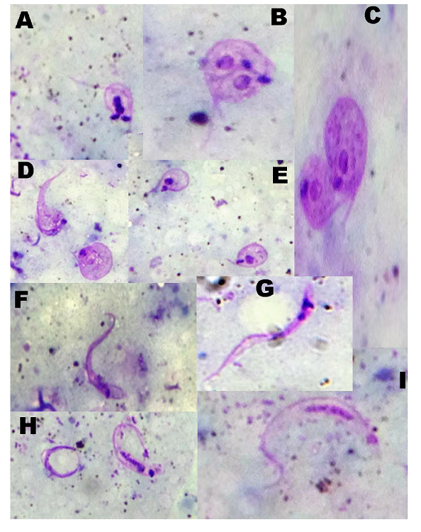 A los insectos que no expulsaron las heces de manera espontánea, se les practicó compresión abdominal y, cuando no fue posible recolectar la muestra, se procedió a inmovilizar el insecto en frío para remover completamente el tubo digestivo con una jeringa de tuberculina bajo el microscopio estereoscópico y luego homogenizarlo en 100 μl de solución fisiológica. Cada alícuota de 5 μl se examinó al fresco y el volumen restante se coloreó con Giemsa. Las láminas se observaron con un microscopio óptico con objetivo de inmersión (100X), y se contabilizaron las diferentes formas evolutivas de T. cruzi (epimastigotes, tripomastigotes, formas en transición, formas en división) en 200 campos 19; las fotografías fueron tomadas con una cámara Panasonic de 16 megapixeles.
