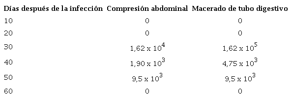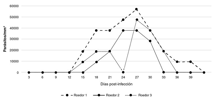 En tres alícuotas de 5 μl de los diferentes macerados intestinales obtenidos, se contabilizó la carga parasitaria o inóculo (4,75 x 104) y, después, se inyectaron a tres ratones por vía intraperitoneal. Posteriormente, se evaluó su capacidad infectiva cada tres días durante 39 días y, en caso de ser positivos para T. cruzi (M/HOM/VE/09/P6), se determinó la parasitemia.