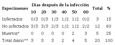 Como huéspedes vertebrados experimentales, se utilizaron 15 ratones albinos machos heterocigotos de dos meses de nacidos, de 18 a 20 g de peso, mantenidos en el bioterio experimental (22 ± 20 °C; humedad relativa: 54 ± 5 %) con alimento comercial ad hoc (Ratarina®) y agua ad libitum.