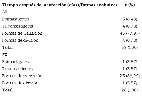 En el cuadro 1 se presenta el número de especímenes de B. ferroae analizados, muertos e infectados durante el xenodiagnóstico. En el cuadro 2 se registra la carga parasitaria de los contenidos intestinales, las heces o la orina de especímenes de B. ferroae. En el cuadro 3 se cuantifican las diferentes formas evolutivas de T. cruzi en B. ferraoe. En la figura 1 se pueden observar todos los estadios evolutivos del parásito (epimastigotes, formas de transición, formas de división y tripomastigotes metacíclicos), encontrados dentro del tubo digestivo de B. ferroae en los diferentes momentos después de la infección.