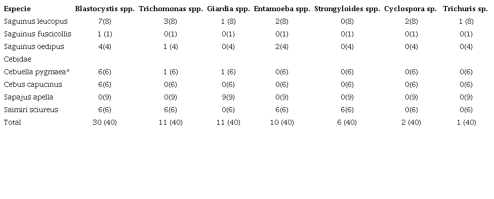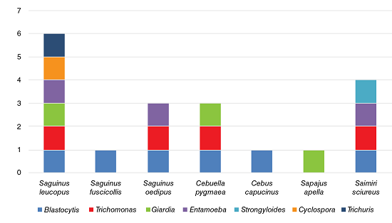 En cuanto a la riqueza parasitaria por especie de primate, Saguinus leucopus (Callitrichidae) fue la que presentó la mayor variedad de parásitos (dos nematodos Trichuris sp. y un adulto sin identificar, y seis protozoos de Giardia spp., Cyclospora spp., Blastocystis spp., Trichomonas spp., Entamoeba spp., y uno sin identificar). Le siguieron Saimiri sciureus (Cebidae), con cuatro parásitos (Blastocystis spp., Trichomonas spp., Entamoeba spp. y Strongyloides spp.), Sag. oedipus, con tres (Giardia spp., Blastocystis spp. y Trichomonas spp.) y Cebuella pygmaea (Callitrichidae), con tres (Blastocystis spp., Trichomonas spp. y Entamoeba spp.). Por último, los cébidos Cebus capucinus (Blastocystis spp.) y Sapajus apella (Giardia spp.), y el calitrícido Sag. fuscicollis (Blastocystis spp.), presentaron un tipo de enteroparásito.