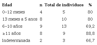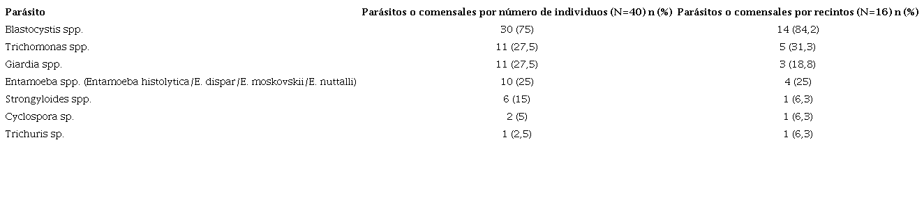 Se tomaron muestras seriadas completas en 16 recintos, todos positivos para parasitismo intestinal en el momento del estudio y se descartaron tres recintos en los cuales se hospedaban diez animales, ya que en ellos no fue posible tomar la totalidad de las muestras del seriado. Así, el grupo evaluado quedó conformado por 40 individuos y el 100 % presentó una entidad parasitaria, por lo menos.