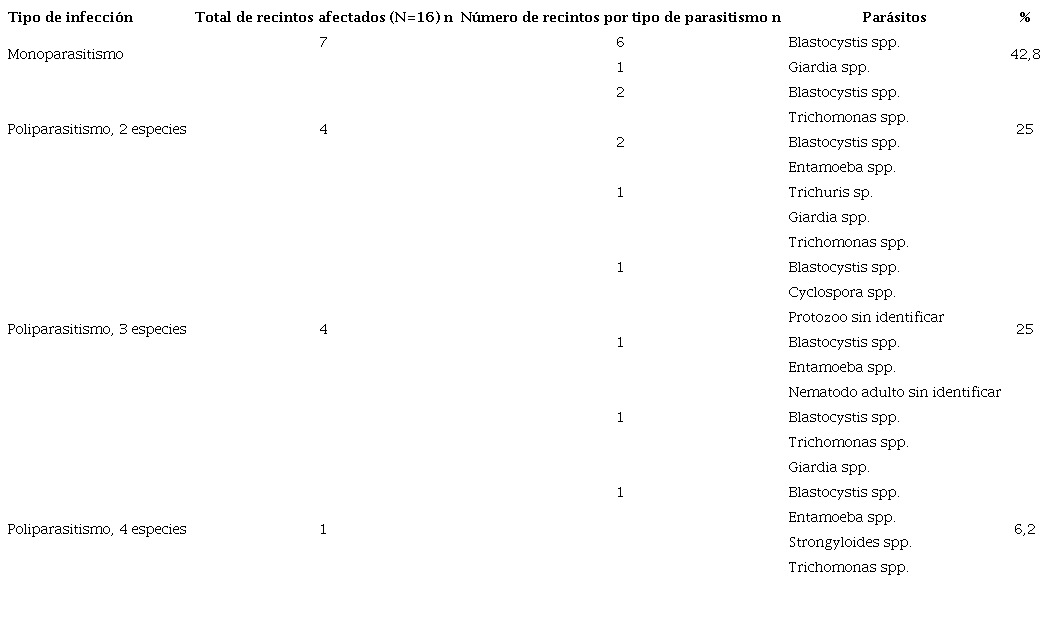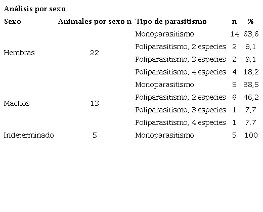 En las 22 hembras, los 13 machos y los 5 individuos de sexo indeterminado, se identificaron agentes parasitarios o comensales. Al analizar el número de recintos y la cantidad de especies parasitarias en cada uno de ellos, así como el número de especies parasitarias en las dos familias de primates, se pudo apreciar que el monoparasitismo era la condición más frecuente tanto en los recintos como por familia, seguido por el poliparasitismo de dos y tres especies, y con menor frecuencia, el poliparasitismo de cuatro especies. En los cuadros 3 y 4 se pueden apreciar las asociaciones entre las diferentes especies de parásitos en los individuos con infecciones múltiples por familia y por recinto.