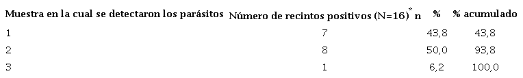 En los recintos en los que se obtuvieron las tres muestras seriadas, mediante el primer examen se diagnosticaron infecciones parasitarias en siete (43,8 %), en tanto que los otros nueve recintos fueron negativos. De estos últimos, ocho fueron positivos en la segunda muestra. El acumulado de positivos para las dos primeras muestras fue del 93,8 %. En el recinto que albergaba al grupo de individuos de Sap. apella, las dos primeras muestras fueron negativas y, en la tercera, el resultado fue positivo para Giardia spp. (cuadro 6). De los tres recintos en los que solo se recolectó una muestra, dos fueron positivos para Blastocystis spp. y el otro fue negativo.