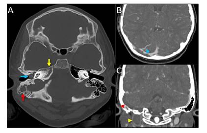 En este caso, la paciente presentaba otitis media con otorrea, parálisis del VI par craneal (contralateral), aunque sin alteración sensitiva en el territorio del nervio trigémino. En la resonancia magnética cerebral se confirmó la presencia de otomastoiditis, apicitis petrosa y trombosis ipsilateral de los senos venosos cerebrales con extensión a la vena yugular interna.