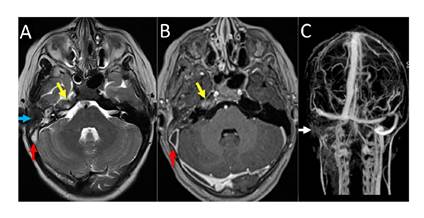 En la resonancia magnética cerebral con contraste realizada nueve días después del procedimiento quirúrgico, se evidenció regresión de los signos inflamatorios en las celdillas mastoideas y el ápex petroso, y recanalización de la trombosis en los senos venosos y la yugular interna (figura 4). Además, hubo resolución de los síntomas de hipertensión intracraneal. Sin embargo, a los dos meses del ingreso hospitalario la parálisis del VI nervio craneal persistía.