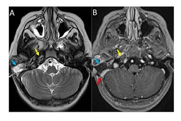 El compromiso de este nervio se explica por el contacto del ápex petroso con la porción del VI par craneal dentro del canal de Dorello en su trayecto por debajo del ligamento petroclival, que está expuesto a procesos inflamatorios (13). Además, es importante estudiar el mimetismo del síndrome de Gradenigo (5) y otras causas de parálisis del nervio motor ocular externo.