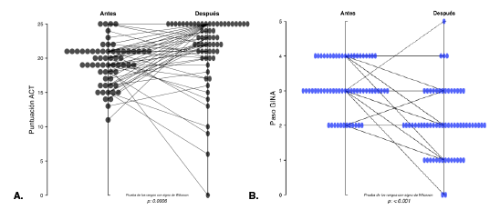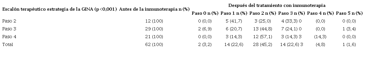 Al evaluar el tratamiento para el asma según el grado de la GINA, se encontró que ningún paciente se encontraba en el paso 1 de tratamiento, 19,4 % (n=12) estaba en el paso 2, el 46,8 % (n=29) en el paso 3, el 33,8 % (n=21) en el paso 4 y ningún paciente estaba en el paso 5. En la evaluación posterior al inicio de la inmunoterapia, el 3,22 % (n=2) no recibía ningún medicamento para el asma, el 22,6 % (n=14) estaba en el paso 1, el 45,2 % (n=28) en el paso 2, el 22,6 % (n=14) en el paso 3, el 4,8 % (n=3) en el paso 4 y el 1,6 % (n=1) en el paso 5 (cuadro 2). Se observó que antes del inicio de la inmunoterapia la mayoría de los pacientes evaluados (80,6 %) estaba en los pasos 3 y 4 de gradación de la GINA, y en el momento de la evaluación posterior, la mayoría (67,6 %) estaba en los pasos 1, 2 y 3. Estos resultados fueron estadísticamente significativos (p=0,001) (figura 2B).
