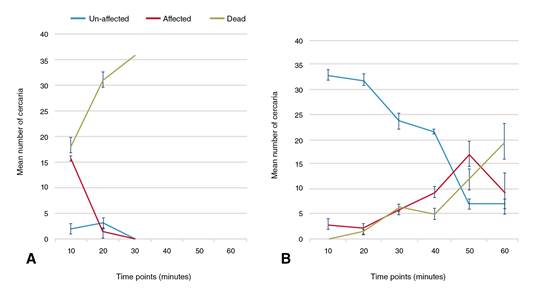 After the first 10 minutes, 91.67% of cercariae from the group B snails were completely unaffected (stage 1) with no recorded cercarial deaths while the remaining cercariae exhibited intermittent spins (stage 2). In contrast, after the same duration, 50.92% of cercariae from PZQ-unexposed snails (group A) died (stage 3). The cercarial death percentage in the same group increased up to 87.3% after 20 minutes of drug exposure with total cercarial deaths occurring at the 30-minute examination point. On the other hand, by increasing the duration of drug exposure, the influence of PZQ on the harvested cercariae from the PZQ-exposed group (group B) displayed slow and gradual enhancing effects.