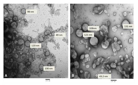 The TEM of the prepared niosomes and PZQ-encapsulated niosomes revealed spherical, smooth surface nanoparticles with average sizes of 69.9-120 nm (figure 4A) and 43.2-131 nm (figure 4B), respectively. The zeta potential of the niosomes was -16.7 mV while that of the PZQ-encapsulated niosomes was -20.2 mV. Besides, the particle size distribution performed by the particle size analyzer revealed the niosomes without PZQ to have a mean particle size of 83.55 nm and showed a polydispersity index of 0.715 (i.e., less than 1) indicating the homogeneous nature of the formulation. On the other hand, the particle size distribution of the PZQ-encapsulated niosomes revealed a mean particle size of 97.14 nm and the polydispersity index was 0.534 (i.e., less than 1).