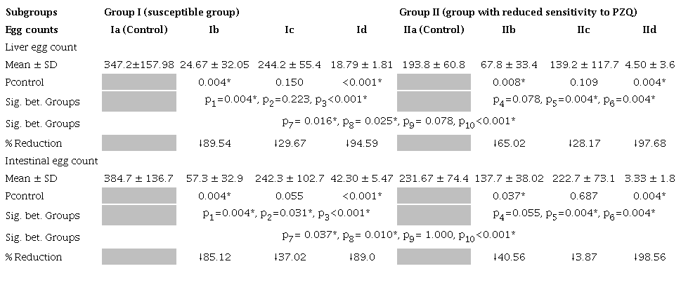 For the PZQ-susceptible isolate, PZQ and PZQ-encapsulated niosomes- treated mice (subgroups Ib and Id) revealed a statistically significant increase in the dead eggs with mean percentages of 47.67% and 69.90%, respectively, and a statistically significant reduction in the immature eggs with mean percentages of 11.83% and 8.95%, respectively (p≤0.05) (table 3).