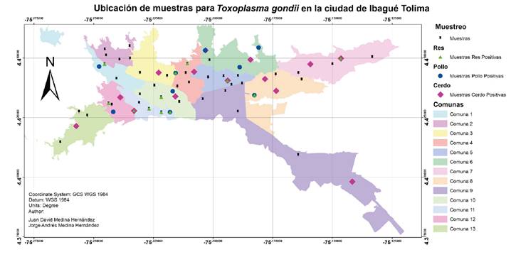 Objective: To determine T. gondii positivity (currently unknown) in meat for human consumption (i.e., beef, chicken, and pork) in the city of Ibague, Colombia.