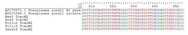 Se encontró una prevalencia de T. gondii del 18,8 % en las muestras de carne (35/186), siendo la prevalencia más alta la de la carne de cerdo (22,5 %) y, la más baja, la de las muestras de carne de pollo (14,5 %) (cuadro 1). Sin embargo, no hubo diferencias significativas entre las prevalencias de las muestras evaluadas. De las 35 muestras positivas, 11 se enviaron a secuenciar debido a que reflejaban una banda fuerte, y cinco de ellas tuvieron una calidad de secuencia aceptable; estas se alinearon (figura 2) y se confirmó que el ADN detectado correspondía a T. gondii.