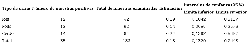 La muestra se calculó utilizando el programa Epi-Info (CDC, versión 7.2.0.1) a partir de los datos recomendados en estudios realizados en otras regiones de Colombia 40,41,43. Se aplicó un margen de error del 5 % y un nivel de confianza del 95 %, para una proporción de la población esperada del 40 %, en tanto que el efecto del diseño muestral se estimó en 0,5 para un tamaño de población infinita, lo que arrojó 186 muestras de carne distribuidas en 62 de res, 62 de pollo y 62 de cerdo.