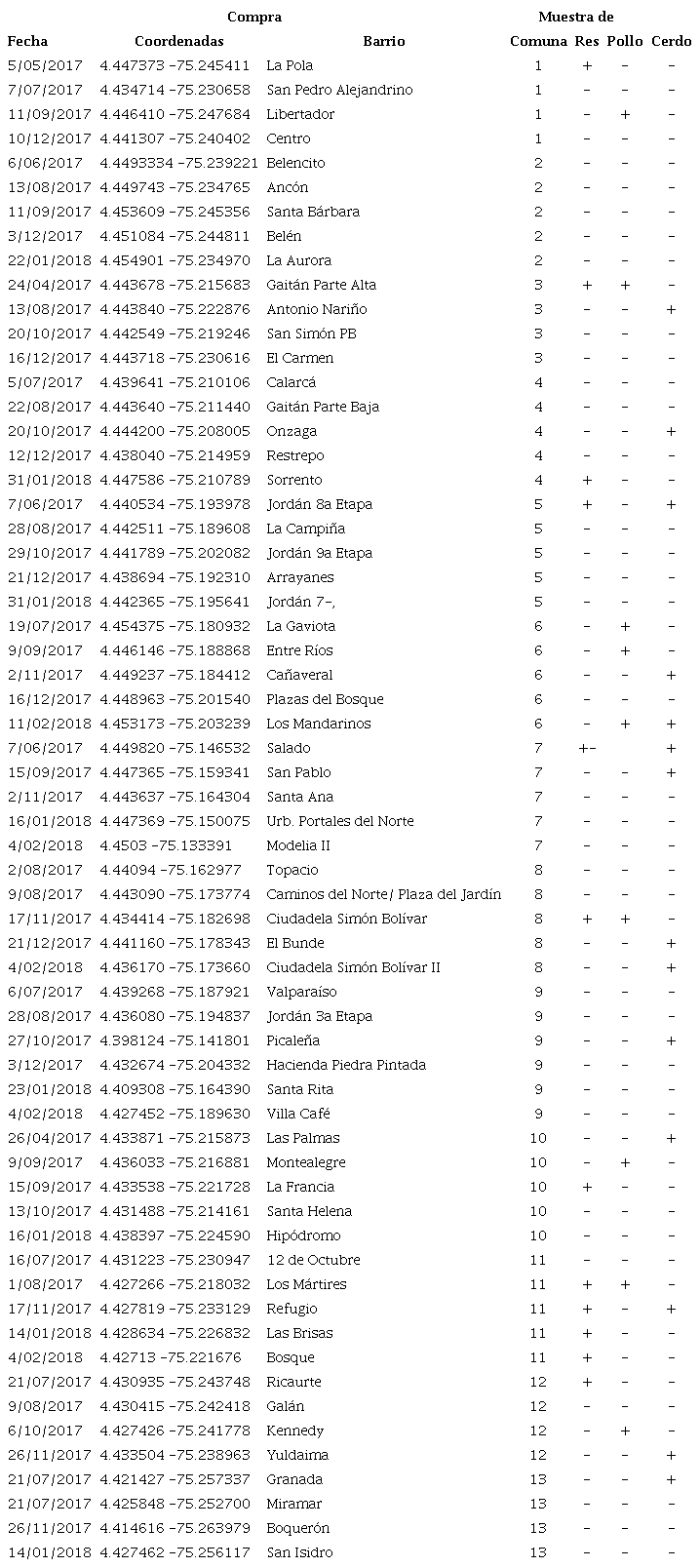 Los resultados obtenidos para cada tipo de carne por barrio se muestran en el cuadro suplementario 1. Con ayuda del programa ArcGIS (versión 10.5), se ubicó en un mapa de la ciudad de Ibagué el total de las muestras con los resultados obtenidos (figura 1). Los cálculos de prevalencia (estimación de proporción) para cada tipo de carne y los intervalos de confianza se presentan en el cuadro 1.
