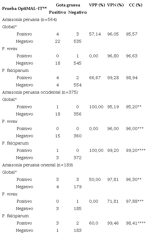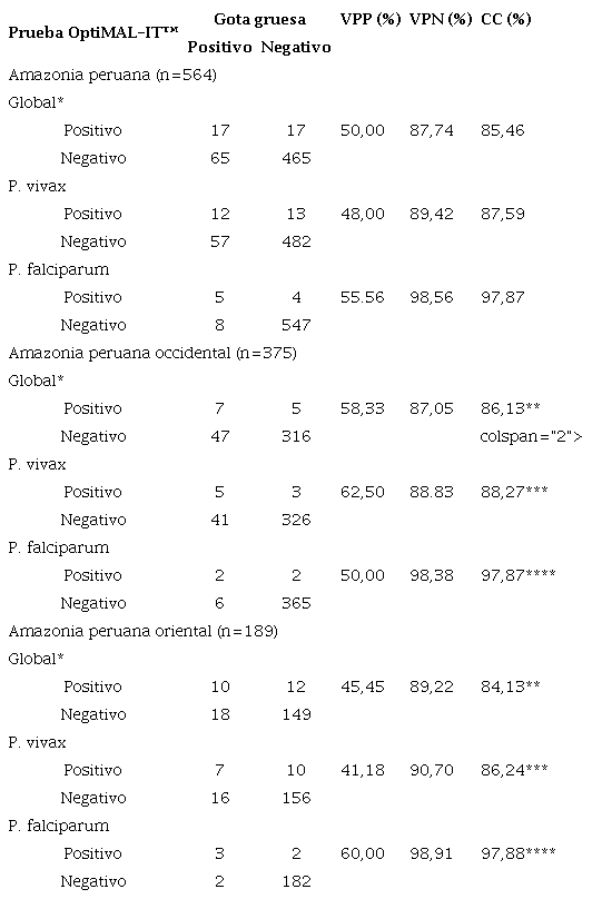 Materials and methods: We conducted an observational, analytical cross-sectional study of diagnostic tests performed in patients with malaria. We selected all the patients attending different health facilities in the Peruvian departments of San Martín and Loreto who met the inclusion criteria. Optical microscopy with thick smear and OptiMAL-IT™ was used on days 2, 3, 7, and 14 for Plasmodium vivax and until day 21 of follow-up for Plasmodium falciparum. Percentages of correctly classified samples and predictive values were calculated, and the results were compared between the western jungle and the eastern jungle using Chi2 or Fisher's exact tests.