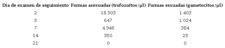 Los días de seguimiento se definieron como aquellos en que se hacía el control del paciente con exámenes de laboratorio por gota gruesa y OptiMAL- IT™: días 2, 3, 7, 14 y 21. El número de parásitos en fase asexual se definió como el número de trofozoítos visibles durante la evaluación microscópica de la gota gruesa. El número de leucocitos en las formas asexuadas se definió como aquel que debía observarse para establecer el número de parásitos en fase asexual encontrado en el recuento parasitario. El número de parásitos en fase sexual se definió como el número de gametocitos visibles durante la evaluación microscópica de la gota gruesa. El número de leucocitos en los parásitos en fase sexual se definió como el número de leucocitos que debía observarse para establecer el número de parásitos en esta fase encontrado en el recuento parasitario.