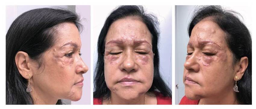 Después de meses de estabilidad clínica con la hidroxicloroquina y la colchicina, se procedió a la extracción quirúrgica de los nódulos restantes, a cargo de especialistas en oftalmología oculoplástica y cirugía plástica, con excelentes resultados cosméticos y recuperación de la autoestima de la paciente (figura 3).