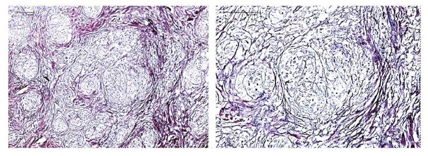 La coloración del retículo resaltó la reticulina alrededor de los granulomas y, ocasionalmente, en su interior. Además, las tinciones de Ziehl-Neelsen, PAS y plata metenemina, con controles positivos adecuados, fueron negativas para hongos y bacilos ácido-alcohol resistentes. Los hallazgos, sin ser diagnósticos, son los de una reacción granulomatosa a cuerpo extraño (material de relleno), de tipo sarcoideo (figura 2).