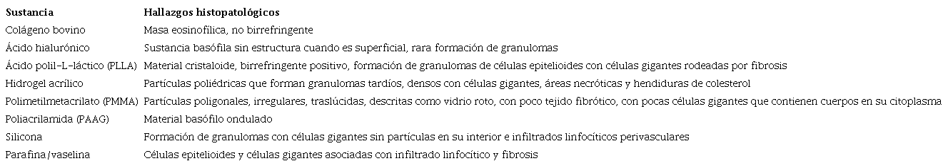 Los materiales de relleno se clasifican en reabsorbibles (meses o años) y permanentes. Entre las sustancias de relleno absorbibles, se encuentran el tejido graso autólogo, el injerto dermograso, el colágeno bovino, el colágeno autólogo, el ácido poliláctico, la hidroxiapatita de calcio y el ácido hialurónico, y entre las de relleno permanentes, se encuentran el polimetilmetacrilato, la silicona, el polimetilsiloxilano, el gel de poliacrilamida, el petrolato, la vaselina y la parafina, entre otros 11 (cuadro 1). Como la mayoría de los pacientes desconocen qué material les fue inyectado y qué tipo en particular, se debe recurrir al apoyo histopatológico para documentar la presencia de una reacción inflamatoria a cuerpo extraño, además de estudios imagenológicos y de otros tipos, para definir su extensión y la naturaleza precisa de la sustancia inyectada.