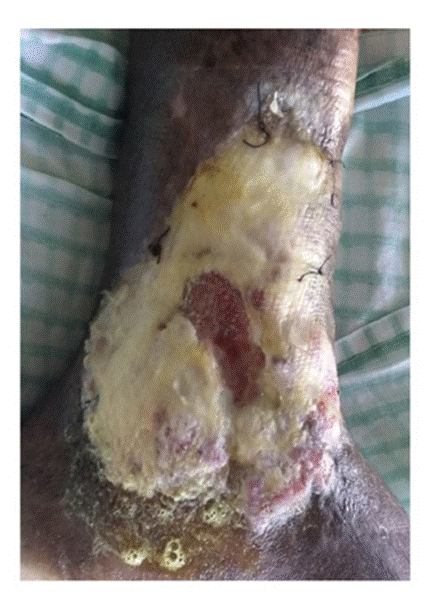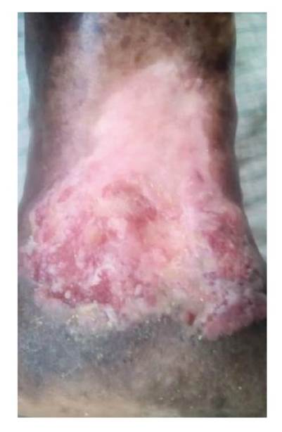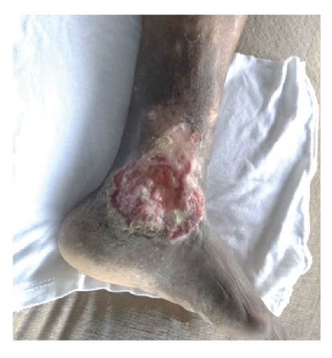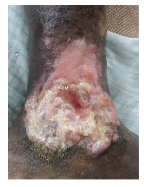 Se trata de una paciente de 89 años de edad, de piel negra y antecedentes de demencia senil, que presentaba una lesión ulcerada de 12 x 10 cm y con 40 años de evolución en el área maleolar interna del miembro inferior izquierdo. La lesión era piriforme, con base inferior, bordes elevados y socavada en su centro en 2 mm, fondo hemorrágico y costroso alternado con zonas de exudado blanquecino adherido; hacia su periferia, se observaban áreas pálidas costrosas y, en la parte inferior, hiperqueratosis exuberante, en tanto que la piel circundante se encontraba hiperpigmentada (figura 1).