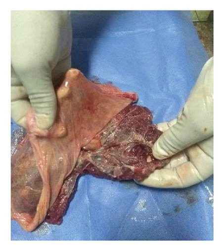 En el quirófano se extrajo la placenta bajo condiciones estériles y se depositó en una mesa auxiliar sobre un paño estéril para, posteriormente, diseccionarla separándola de la placenta (figura 2)
