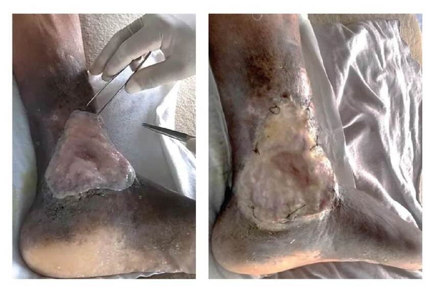 En el caso que aquí se informa, la úlcera de miembro inferior tenía 40 años de evolución y había una considerable pérdida de tejido, el cual se había vuelto senescente en el proceso de inflamación o proliferación, perdiendo la capacidad de epitelización después de múltiples medidas terapéuticas, algunas indicadas por el personal médico y otras recogidas de las prácticas populares para la curación de estas lesiones.
