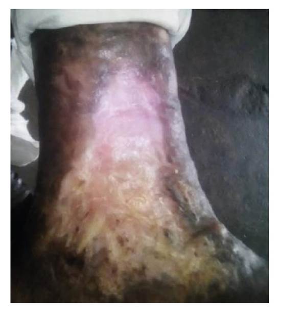 Durante todo el proceso de cicatrización, se hizo la valoración clínica diaria y se observaron discretas modificaciones en el tejido, hasta que, en el día 60 después de la implantación del aloinjerto de membrana amniótica humana fresca, la úlcera estaba cicatrizada en toda su superficie y se había formado una cicatriz rosada clara en cuyos bordes se apreciaron intentos de pigmentación (figura 7).