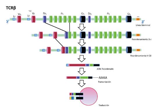 En cada linfocito la recombinación somática elabora un exón que codifica para la región variable a partir de la selección de un segmento variable (V), un segmento de unión (J) y un segmento de diversidad (D), así como de la adición de nucleótidos N y P que posteriormente se transcriben en ARNm y, finalmente, se traducen y maduran en una proteína funcional (figura 1). El segmento D solo está presente en los lo de las cadenas pesadas de Ig, en tanto que los loci β y δ son exclusivos de las del TCR. La recombinación alélica ocurre cuando se unen los fragmentos variables de diversidad y unión, la llamada recombinación V(D)J, que se regula por medio de exclusión alélica; una vez que un alelo se ha reordenado, se envía una señal al otro para interrumpir el proceso 7.