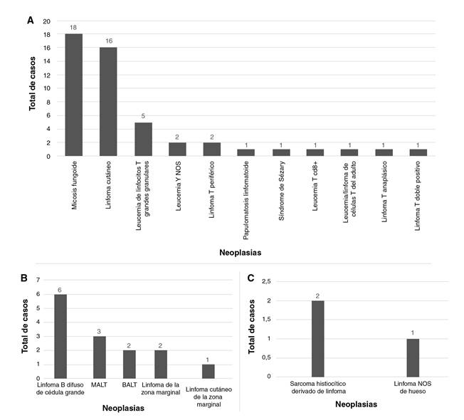 Clonalidad en proliferaciones de células T. Se analizaron 63 linfomas de células T, de los cuales 44 correspondieron a linfomas cutáneos (micosis fungoides, linfomas cutáneos de células T y linfomas cutáneos NOS) y 18 a linfomas de otro origen (leucemia de linfocitos T grandes granulares, linfoma T periférico, síndrome de Sézary, linfoma T anaplásico, linfoma T doble positivo, papulomatosis linfomatoide, leucemia T NOS, leucemia T CD8+ y leucemia/linfoma de células T del adulto) (figura 4B).